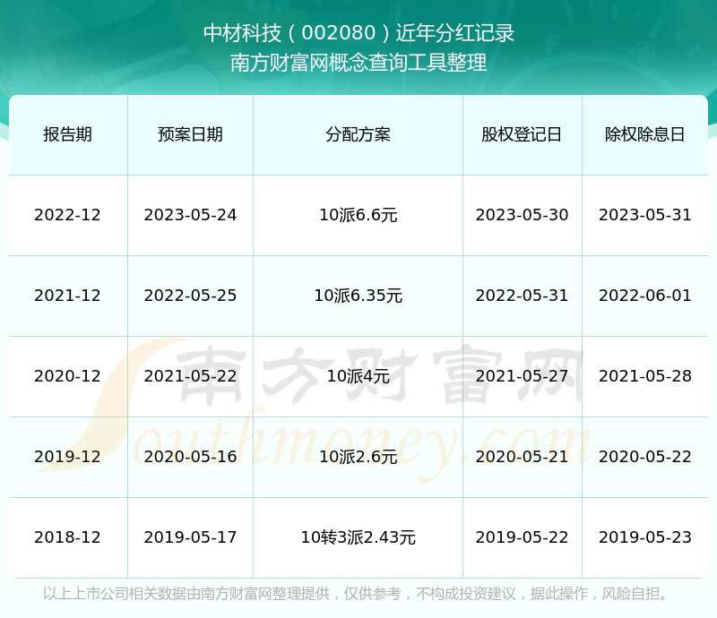 中材科技最新一次公布的分紅方案為10派6.6元。本次權(quán)益分派股權(quán)登記日為2023年5月30日,除權(quán)除息日為2023年5月31日,派息日為2023年5月31日。