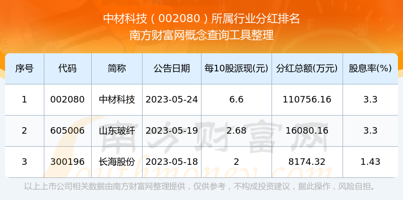 按照南方財富網(wǎng)趨勢選股系統(tǒng)統(tǒng)計,中材科技所屬行業(yè)為玻璃纖維行業(yè),玻璃纖維行業(yè)分紅排名情況如下表: