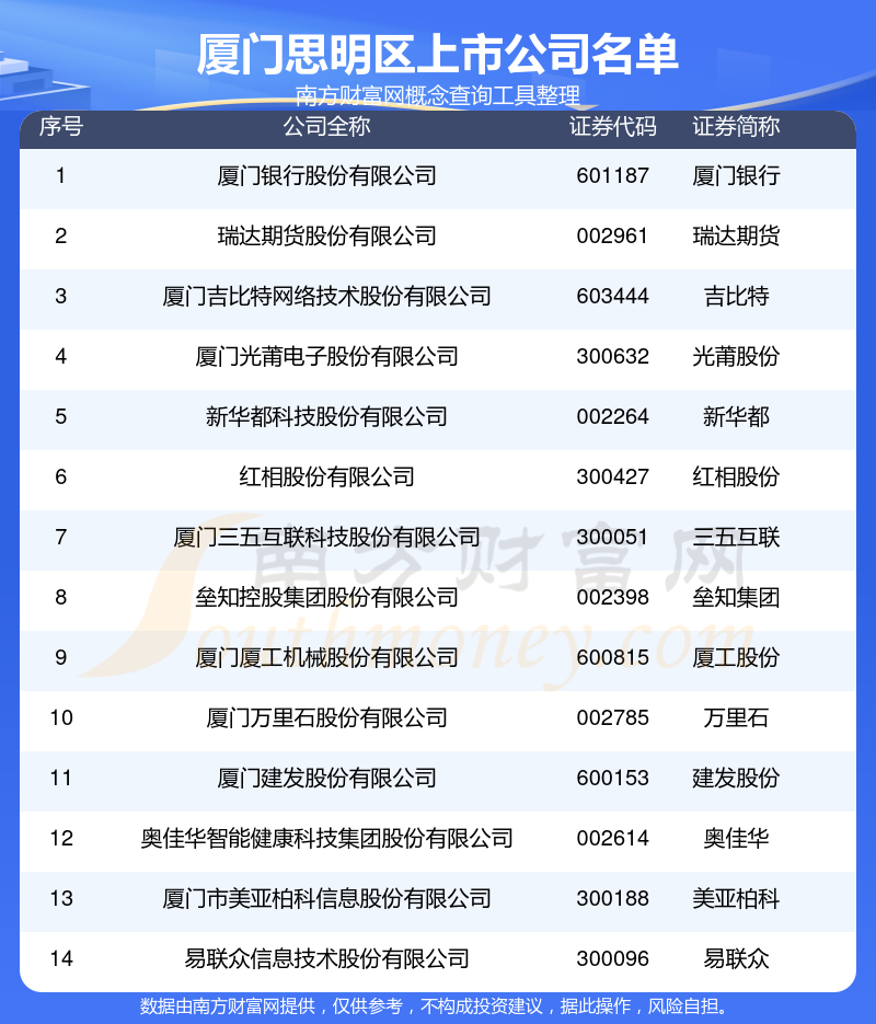 數(shù)量上,截至10月3日,廈門思明區(qū)共有14家A股上市公司。其中,上交所4家(建發(fā)股份、廈工股份、廈門銀行、吉比特等),深交所10家(新華都、壘知集團(tuán)、奧佳華、萬里石、瑞達(dá)期貨、璉升科技、易聯(lián)眾、國投智能、紅相股份、光莆股份等)。