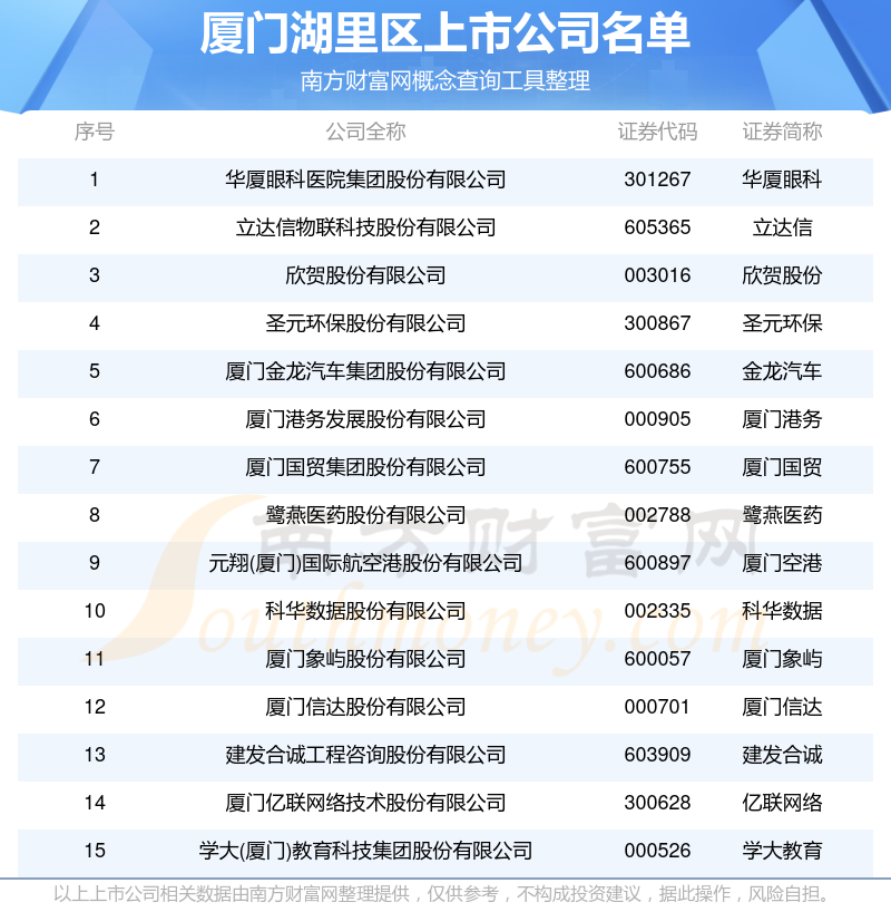 數量上,截至10月3日,廈門湖里區(qū)共有15家A股上市公司。具體分布為上海證券交易所:廈門象嶼、金龍汽車、廈門國貿、廈門空港、建發(fā)合誠、立達信等6家,深圳證券交易所:學大教育、廈門信達、廈門港務、科華數據、鷺燕醫(yī)藥、欣賀股份、億聯網絡、圣元環(huán)保、華廈眼科等9家。