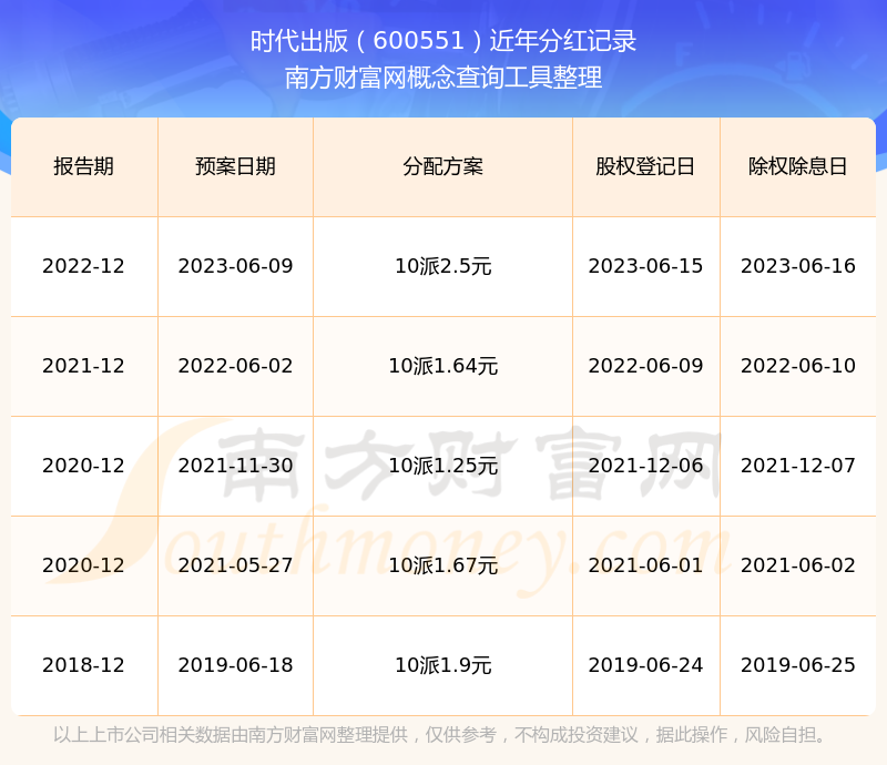 時(shí)代出版最新一次公布的分紅方案為10派2.5元。本次權(quán)益分派股權(quán)登記日為2023年6月15日,除權(quán)除息日為2023年6月16日,派息日為2023年6月16日。