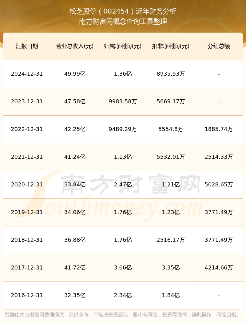 2024年松芝股份總營收49.99億,同比增長5.05%;凈利潤1.36億,同比增長36.69%;銷售毛利率15.17%。