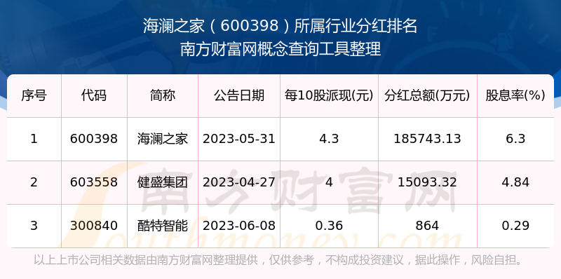 按照南方財富網(wǎng)趨勢選股系統(tǒng)統(tǒng)計,海瀾之家所屬行業(yè)為服飾行業(yè),服飾行業(yè)分紅排名情況如下表: