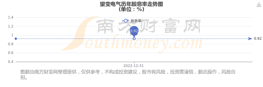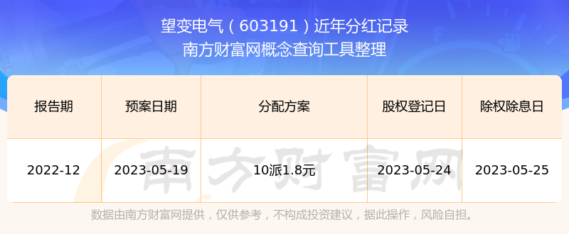望變電氣最新一次公布的分紅方案為10派1.8元。本次權(quán)益分派股權(quán)登記日為2023年5月24日,除權(quán)除息日為2023年5月25日,派息日為2023年5月25日。