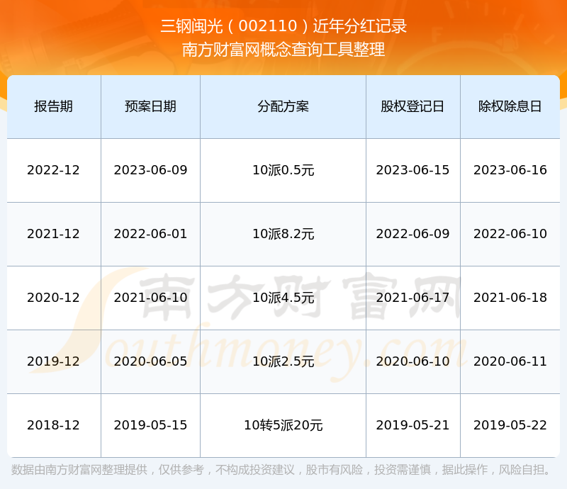 三鋼閩光最新一次公布的分紅方案為10派0.5元。本次權(quán)益分派股權(quán)登記日為2023年6月15日,除權(quán)除息日為2023年6月16日,派息日為2023年6月16日。