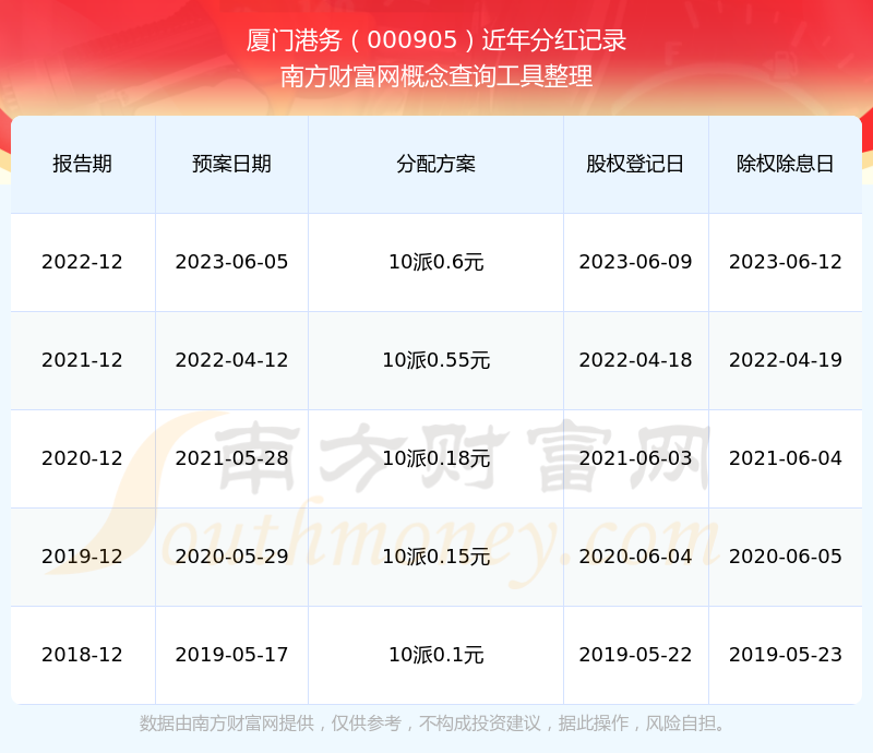 廈門港務最新一次公布的分紅方案為10派0.6元。本次權益分派股權登記日為2023年6月9日,除權除息日為2023年6月12日,派息日為2023年6月12日。