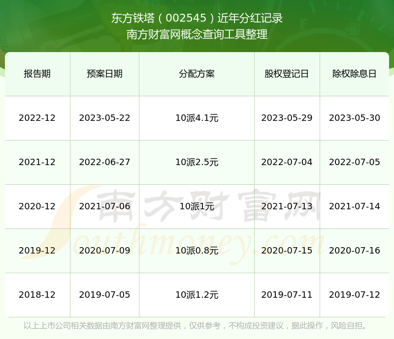 東方鐵塔最新一次公布的分紅方案:10派4.1元。