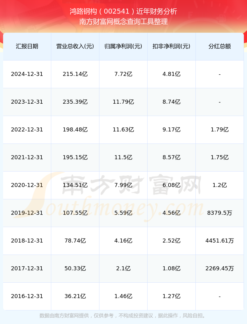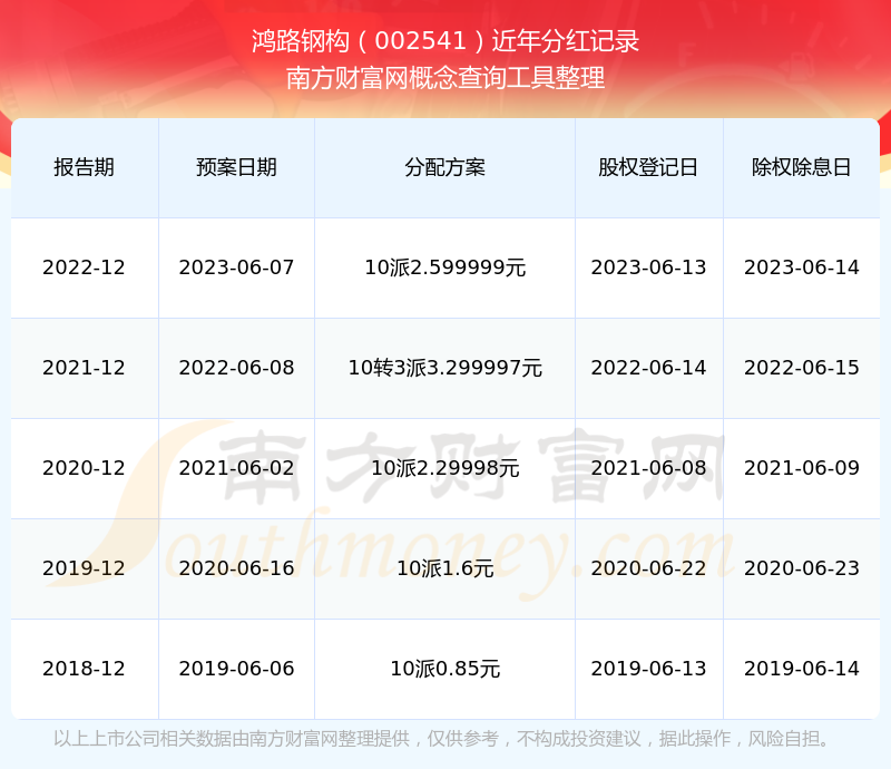 鴻路鋼構最新一次公布的分紅方案:10派2.599999元。