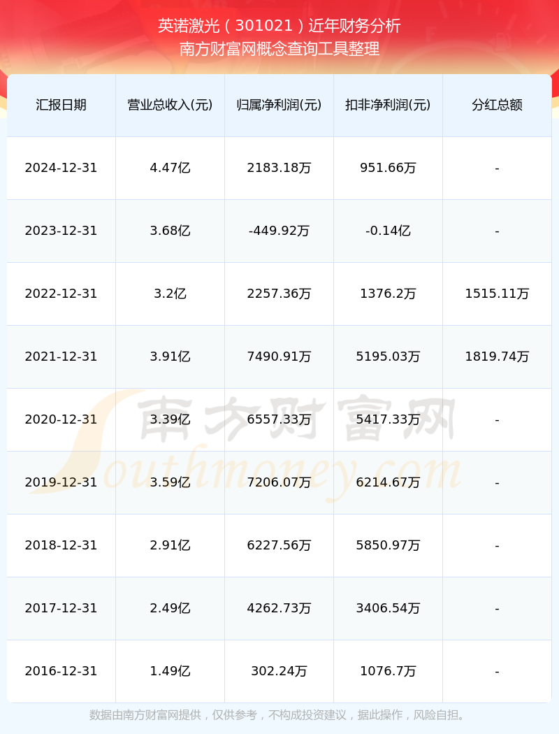 英諾激光公司2024年實現(xiàn)營業(yè)收入4.47億元,同比增長21.41%;凈利潤2183.18萬元,同比增長585.24%;毛利率44.01%。