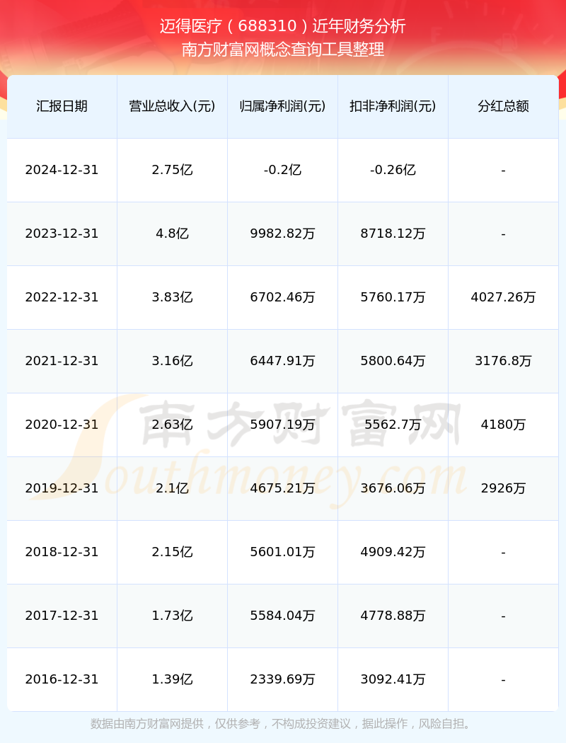 邁得醫(yī)療公司2024年實現(xiàn)營業(yè)收入2.75億元,同比增長-42.77%;凈利潤-1998.12萬元,同比增長-120.02%;毛利率43.85%。