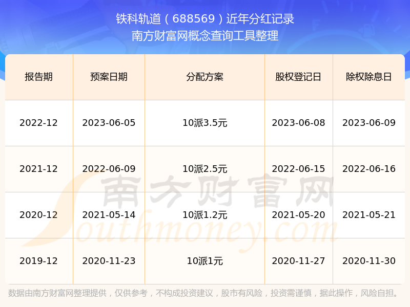 鐵科軌道最新一次公布的分紅方案為10派3.5元。本次權(quán)益分派股權(quán)登記日為2023年6月8日,除權(quán)除息日為2023年6月9日,派息日為2023年6月9日。