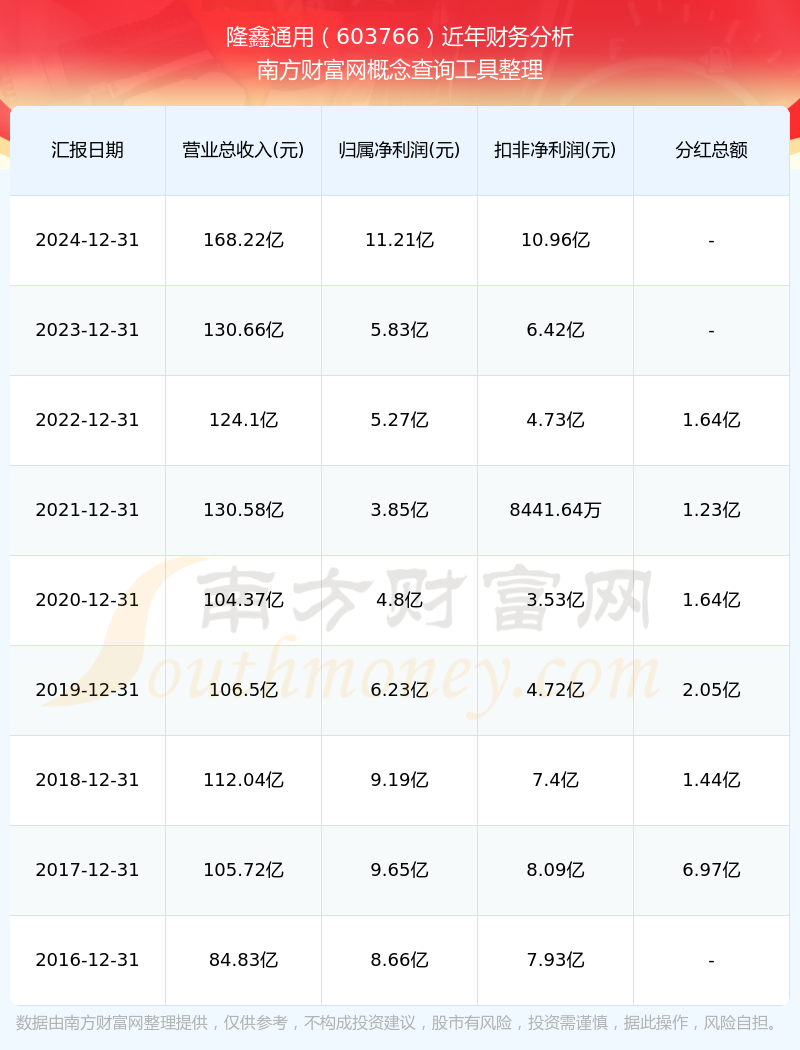 2024年報(bào)顯示,隆鑫通用實(shí)現(xiàn)營收168.22億,同比增長28.74%;凈利潤11.21億,同比增長92.19%;毛利率17.59%。