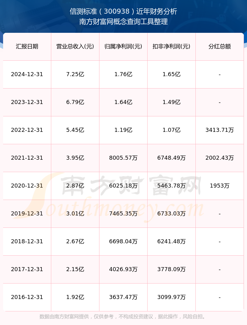 信測標準公司2024年實現(xiàn)營業(yè)收入7.25億元,同比增長6.71%;凈利潤1.76億元,同比增長7.67%;毛利率57.99%。