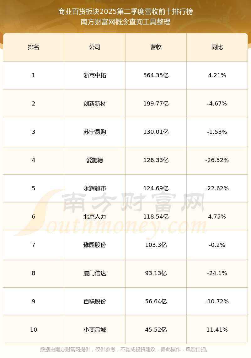 按照南方財(cái)富網(wǎng)概念查詢工具統(tǒng)計(jì),該股所屬板塊為商業(yè)百貨板塊,該板塊共有75只股票,利群股份2025第二季度營(yíng)收在該板塊中排名為第22名,該板塊2025第二季度營(yíng)收排名前十的股票如下表: