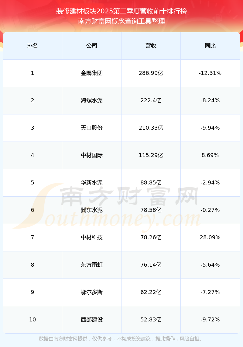 按照南方財(cái)富網(wǎng)概念查詢工具統(tǒng)計(jì),該股所屬板塊為裝修建材板塊,該板塊共有82只股票,菲林格爾2025第二季度營(yíng)收在該板塊中排名為第82名,該板塊2025第二季度營(yíng)收排名前十的股票如下表:
