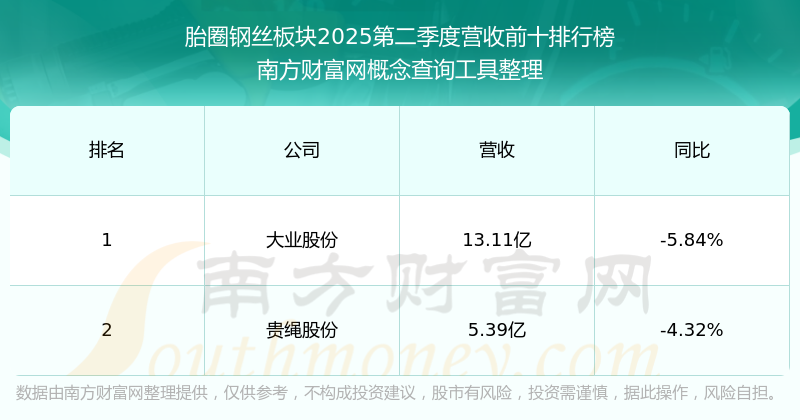 按照南方財富網概念查詢工具統(tǒng)計,該股所屬板塊為胎圈鋼絲板塊,該板塊共有2只股票,大業(yè)股份2025第二季度營收在該板塊中排名為第1名,該板塊2025第二季度營收排名前十的股票如下表: