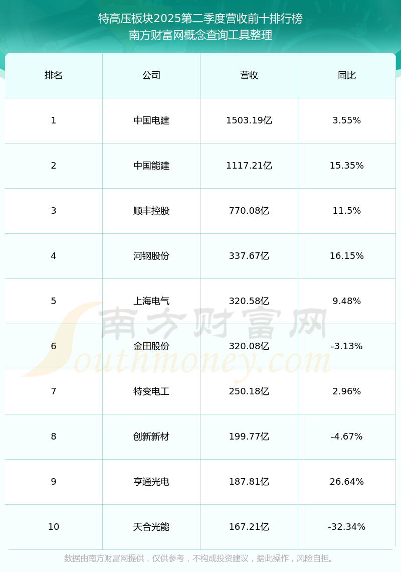 按照南方財富網(wǎng)概念查詢工具統(tǒng)計,該股所屬板塊為特高壓板塊,該板塊共有182只股票,特變電工2025第二季度營收在該板塊中排名為第7名,該板塊2025第二季度營收排名前十的股票如下表: