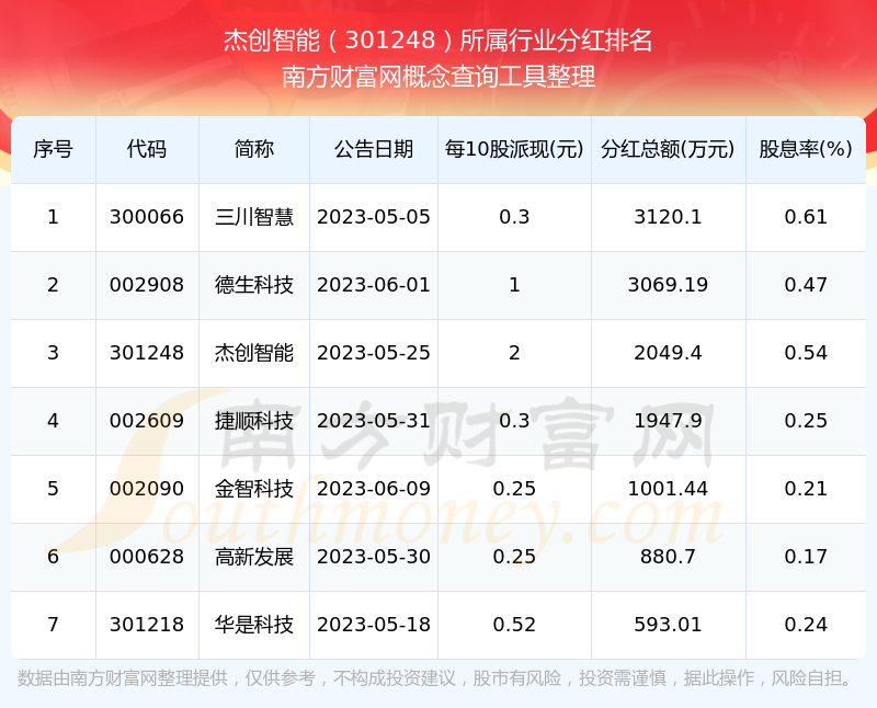 二、杰創(chuàng)智能301248行業(yè)分紅排名