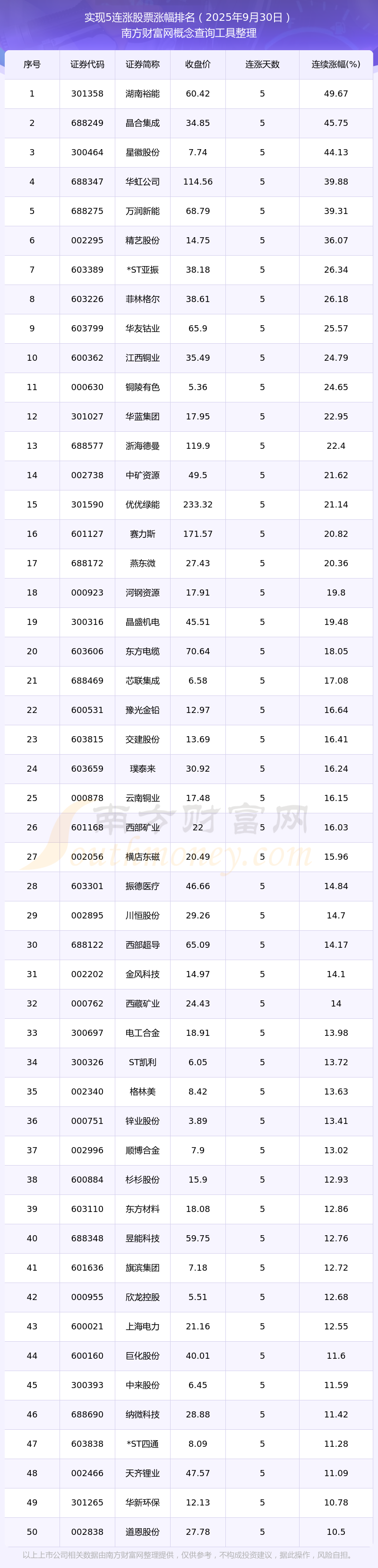 2025年9月30日實現(xiàn)5連漲股票漲幅排名