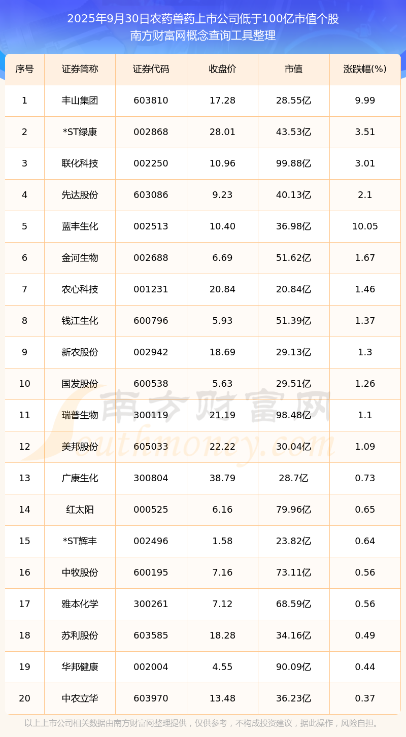 截止2025年9月30日,農(nóng)藥獸藥上市公司市值低于100億的個(gè)股共有31只。其中,市值較高的有聯(lián)化科技、瑞普生物、海翔藥業(yè),市值分別為99.88億元、98.48億元、91.94億元。