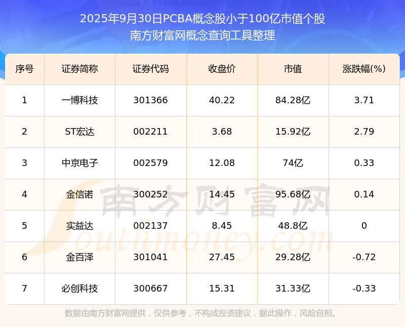 截止2025年9月30日,PCBA概念股市值小于100億的個(gè)股共有7只。其中,市值較高的有金信諾、一博科技、中京電子,市值分別為95.68億元、84.28億元、74億元。