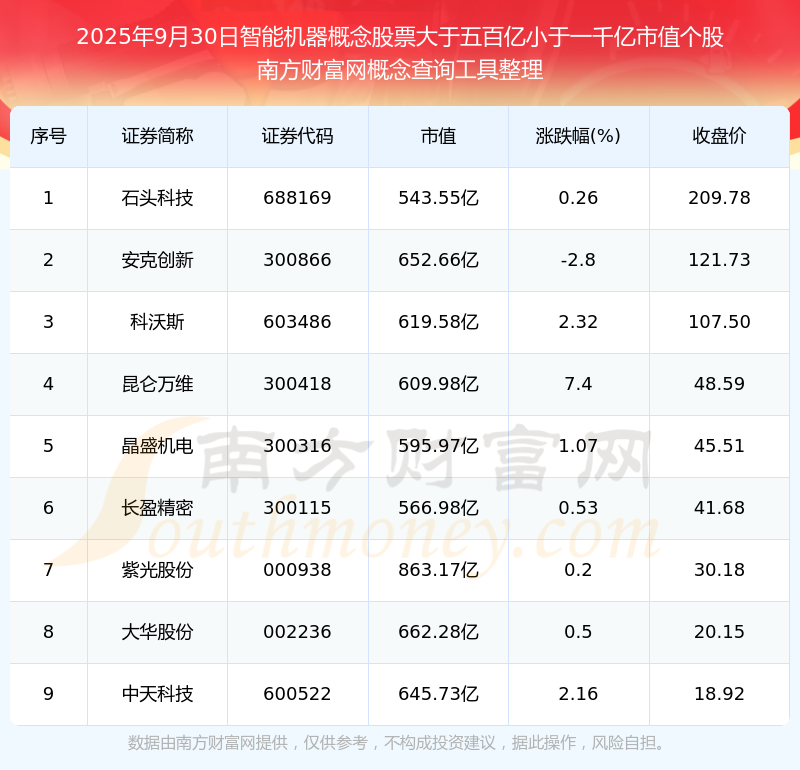 截止2025年9月30日,智能機器概念股票市值大于五百億小于一千億的個股共有9只。其中,市值較高的有紫光股份、大華股份、安克創(chuàng)新,市值分別為863.17億元、662.28億元、652.66億元。