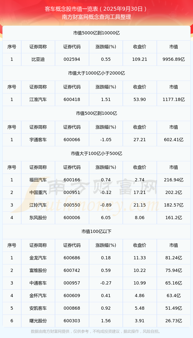 截止2025年9月30日,客車概念股中金龍汽車、富維股份、中通客車、金杯汽車、安凱客車等6家市值位于不足100億之列;福田汽車、中國重汽、江鈴汽車等4家市值位于100億到500億之列;宇通客車市值位于500億到1000億之列;江淮汽車市值位于1000億到2000億之列;比亞迪市值位于5000億到10000億之列。