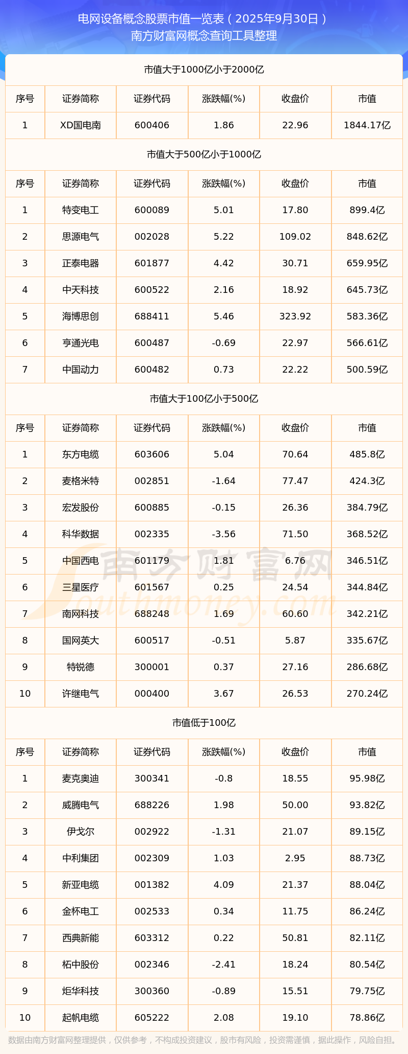 截止2025年9月30日,電網(wǎng)設(shè)備概念股票中威騰電氣、中利集團(tuán)、新亞電纜等65家市值位于不足100億之列;東方電纜、宏發(fā)股份、科華數(shù)據(jù)等27家市值位于100億到500億之列;特變電工、思源電氣、正泰電器等7家市值位于500億到1000億之列;XD國(guó)電南市值位于1000億到2000億之列。