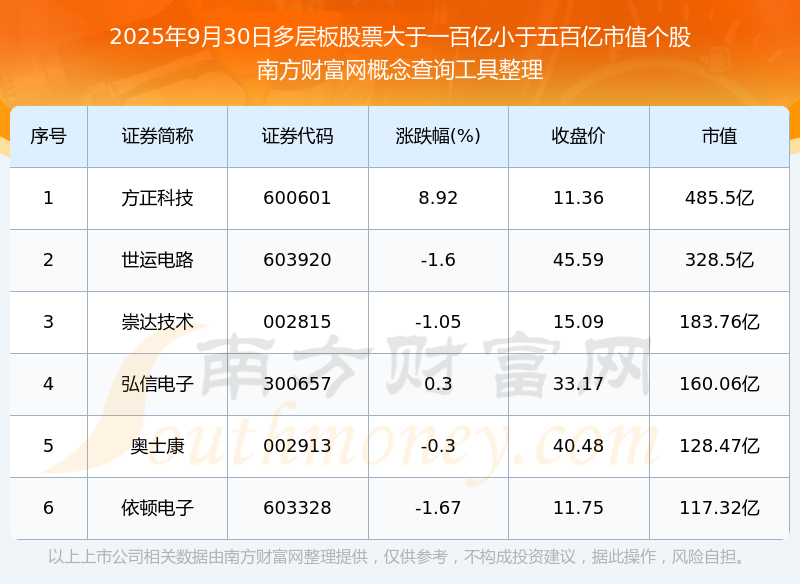 截止2025年9月30日,多層板股票市值大于一百億小于五百億的個股共有6只。其中,市值較高的有方正科技、世運電路、崇達技術,市值分別為485.5億元、328.5億元、183.76億元。