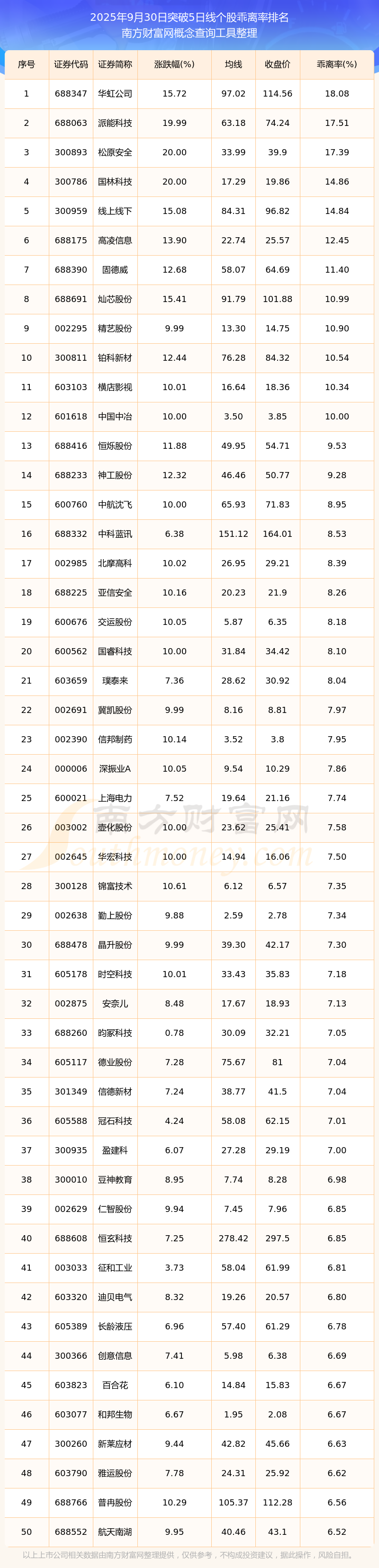 2025年9月30日突破5日線個股乖離率排名