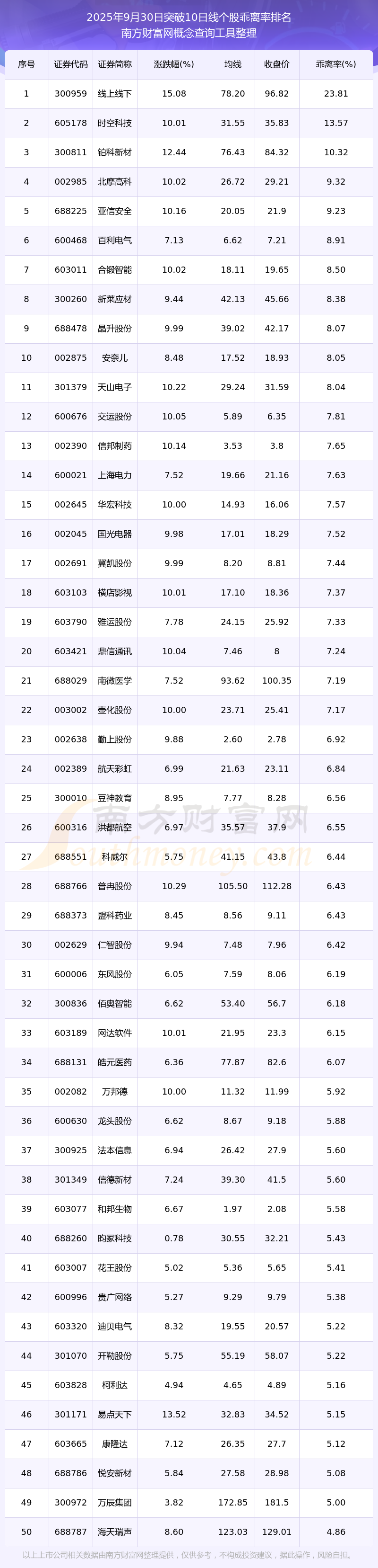 根據(jù)南方財富網(wǎng)概念查詢工具數(shù)據(jù)統(tǒng)計,截止2025年9月30日收盤,共有716只個股收盤價向上突破了10日線,其中乖離率較大的個股有線上線下、時空科技、鉑科新材、北摩高科、亞信安全等,乖離率分別為23.81%、13.57%、10.32%、9.32%、9.23%。