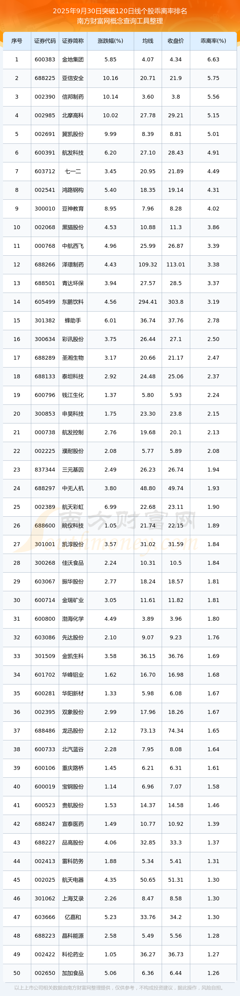 2025年9月30日突破半年線個(gè)股乖離率排名