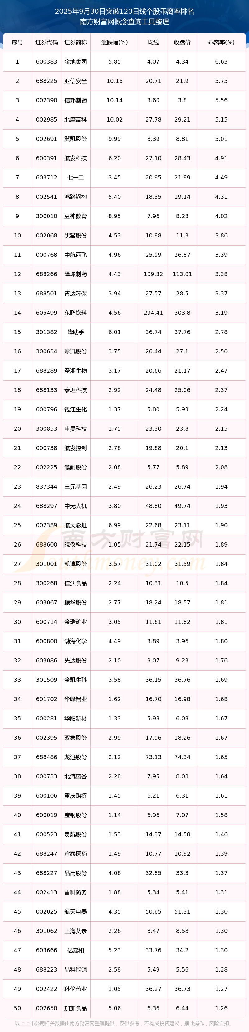 根據(jù)南方財富網(wǎng)概念查詢工具數(shù)據(jù)統(tǒng)計,截止2025年9月30日收盤,共有119只個股收盤價向上突破了半年線,其中乖離率較大的個股有金地集團(tuán)、亞信安全、信邦制藥、北摩高科、冀凱股份等,乖離率分別為6.63%、5.75%、5.56%、5.15%、5.01%。
