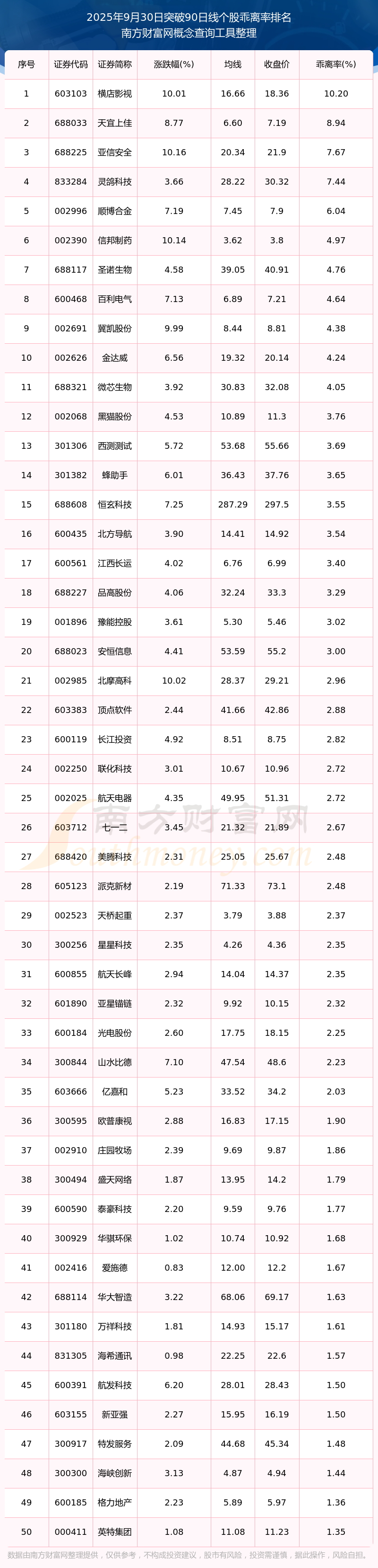 根據(jù)南方財富網(wǎng)概念查詢工具數(shù)據(jù)統(tǒng)計,截止2025年9月30日收盤,共有168只個股收盤價向上突破了90日線,其中乖離率較大的個股有橫店影視、天宜上佳、亞信安全、靈鴿科技、順博合金等,乖離率分別為10.20%、8.94%、7.67%、7.44%、6.04%。