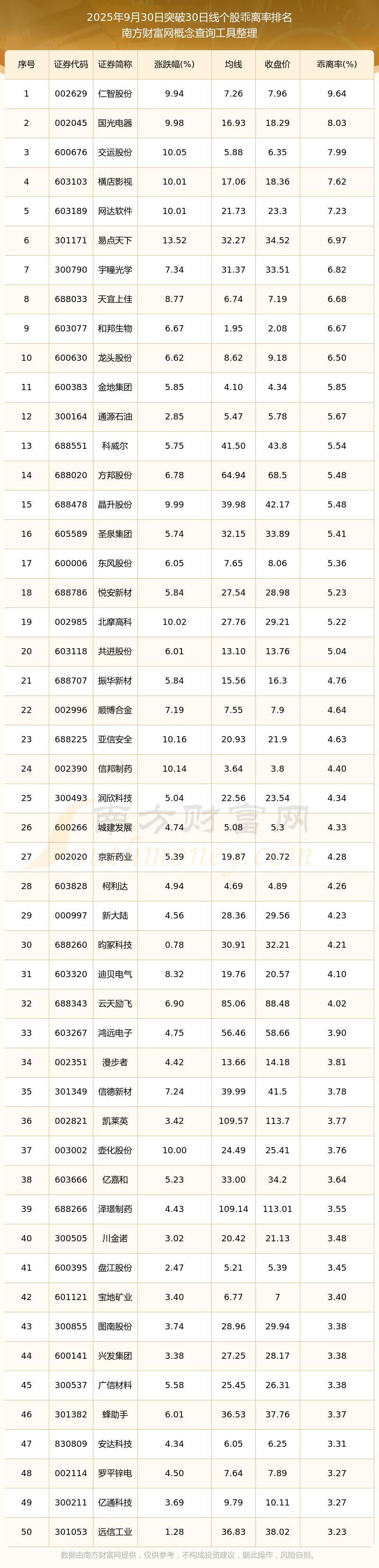 2025年9月30日突破30日線個(gè)股乖離率排名