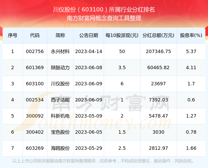按照南方財(cái)富網(wǎng)趨勢(shì)選股系統(tǒng)統(tǒng)計(jì),川儀股份所屬行業(yè)為儀器儀表行業(yè),儀器儀表行業(yè)分紅排名情況如下表: