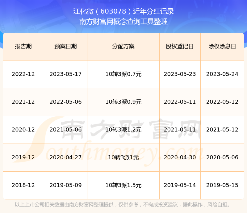 江化微最新一次公布的分紅方案為10轉3派0.7元。本次權益分派股權登記日為2023年5月23日,除權除息日為2023年5月24日,派息日為2023年5月24日。