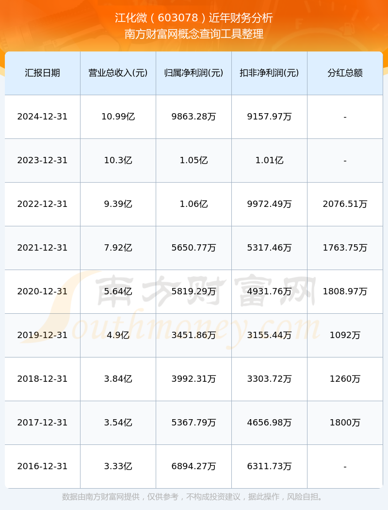 2024年江化微總營收10.99億,同比增長6.73%;凈利潤9863.28萬,同比增長-6.29%;銷售毛利率25.31%。