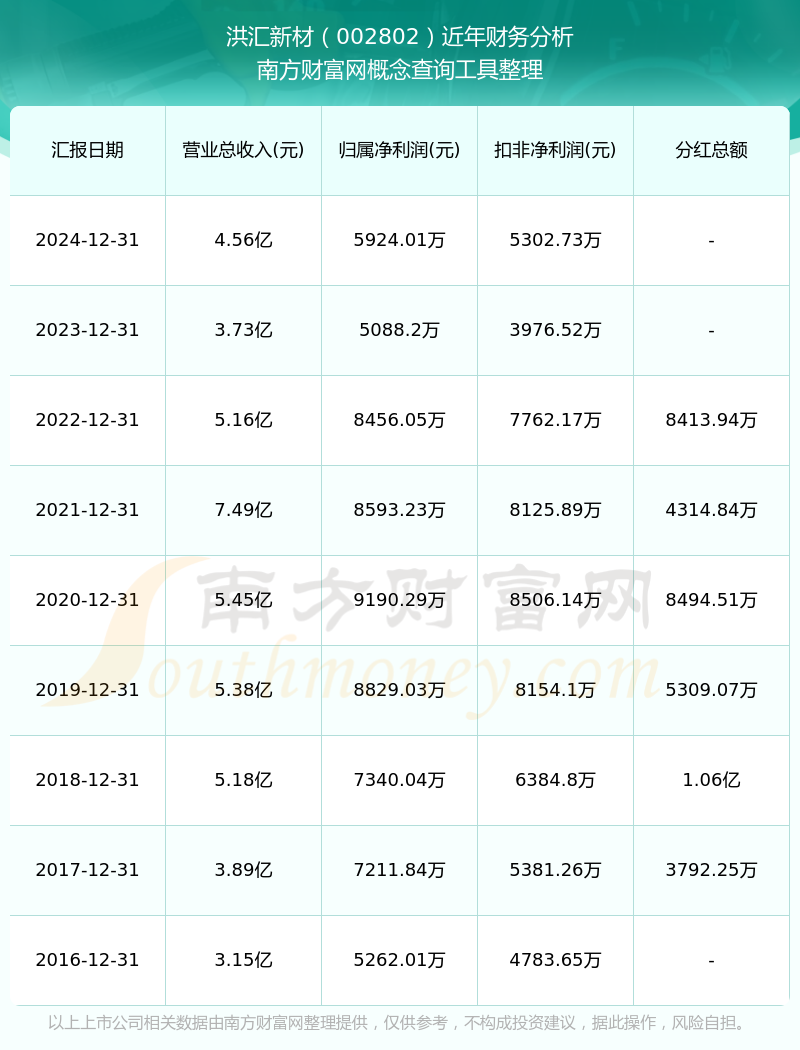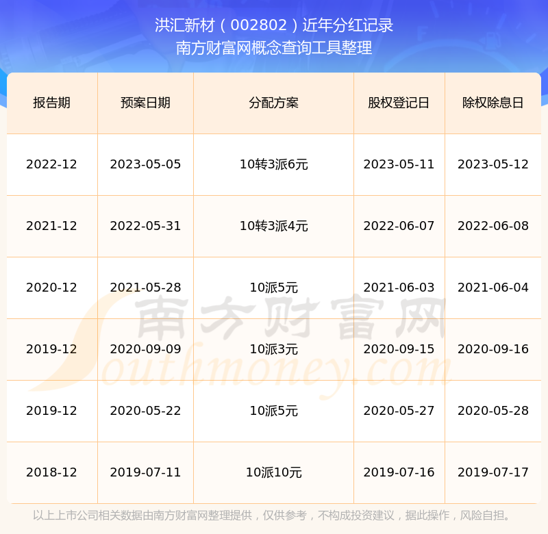 洪匯新材最新一次公布的分紅方案為10轉(zhuǎn)3派6元。本次權(quán)益分派股權(quán)登記日為2023年5月11日,除權(quán)除息日為2023年5月12日,派息日為2023年5月12日。
