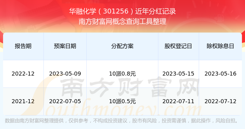 華融化學最新一次公布的分紅方案為10派0.8元。本次權(quán)益分派股權(quán)登記日為2023年5月15日,除權(quán)除息日為2023年5月16日,派息日為2023年5月16日。