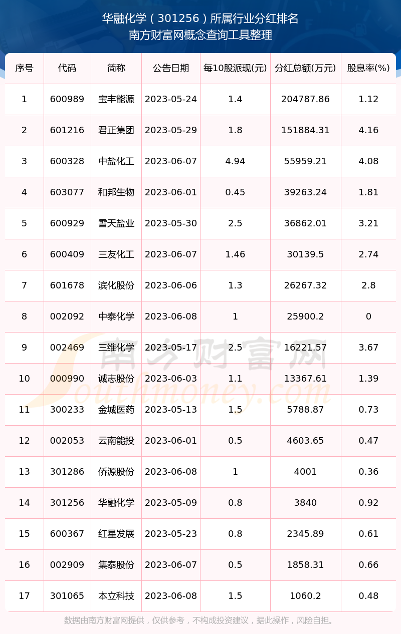 按照南方財富網(wǎng)趨勢選股系統(tǒng)統(tǒng)計,華融化學所屬行業(yè)為化學原料行業(yè),化學原料行業(yè)分紅排名情況如下表: