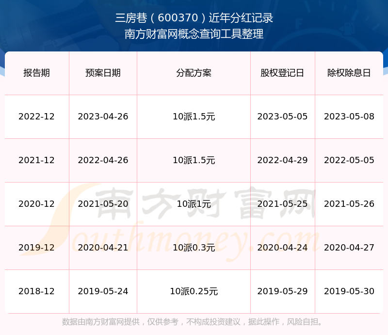 三房巷最新一次公布的分紅方案為10派1.5元。本次權(quán)益分派股權(quán)登記日為2023年5月5日,除權(quán)除息日為2023年5月8日,派息日為2023年5月8日。
