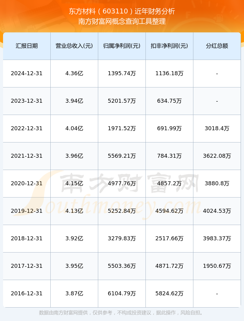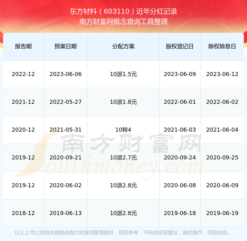 東方材料最新一次公布的分紅方案為10派1.5元。本次權(quán)益分派股權(quán)登記日為2023年6月9日,除權(quán)除息日為2023年6月12日,派息日為2023年6月12日。