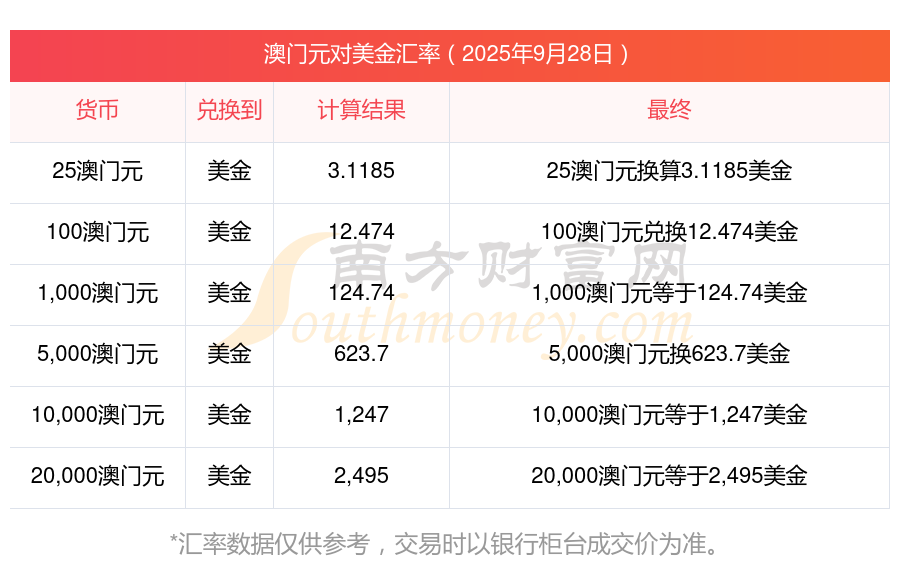 2025年9月28日匯率行情:41澳門元對美金匯率多少