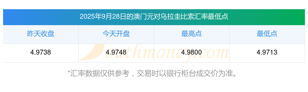 今日澳門元匯價(jià):2025年9月28日24澳門元兌烏拉圭比索匯價(jià)一覽表
