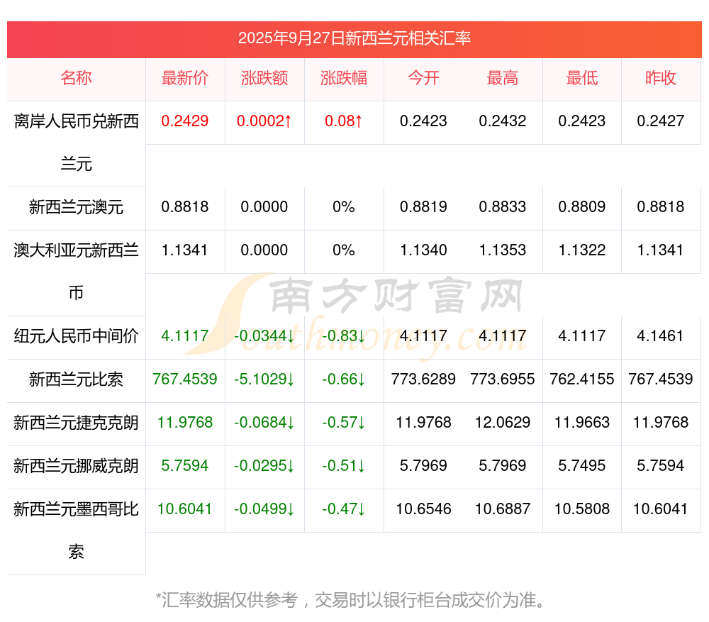 2025年9月27日新西蘭元相關(guān)匯率查詢