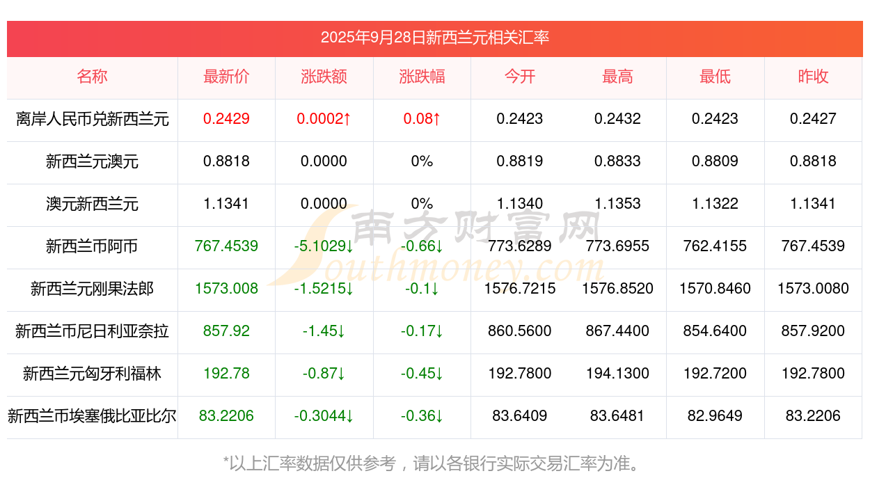 2025年9月28日新西蘭元相關(guān)匯率查詢