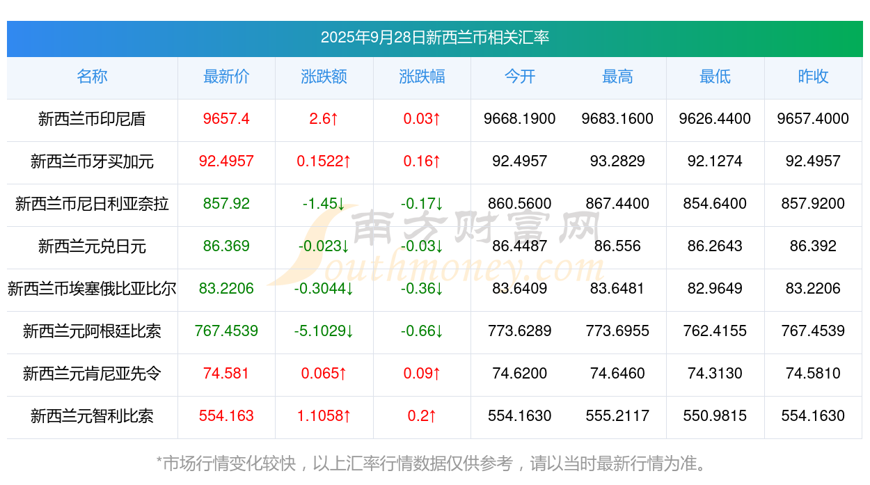 2025年9月28日新西蘭幣相關(guān)匯率查詢