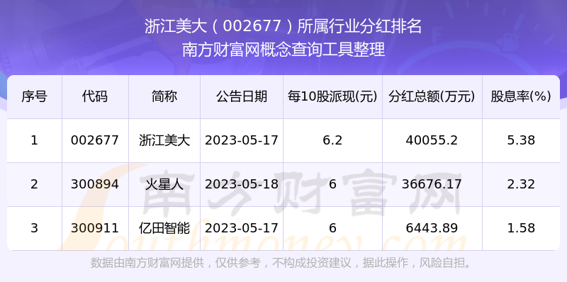 按照南方財富網(wǎng)趨勢選股系統(tǒng)統(tǒng)計,浙江美大所屬行業(yè)為集成灶行業(yè),集成灶行業(yè)分紅排名情況如下表: