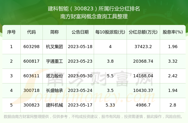 按照南方財富網(wǎng)趨勢選股系統(tǒng)統(tǒng)計,建科智能所屬行業(yè)為工程機械行業(yè),工程機械行業(yè)分紅排名情況如下表: